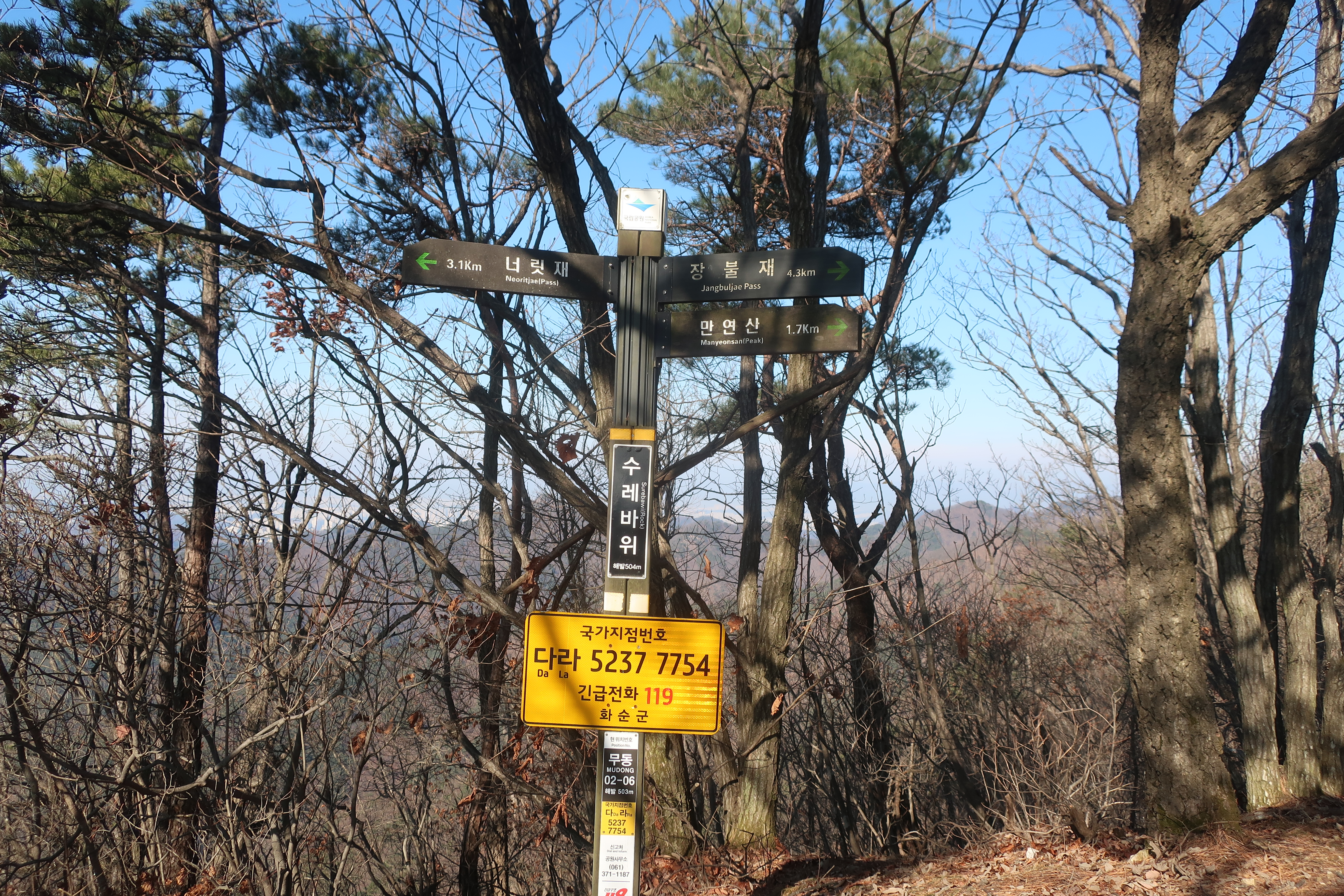 만연산 정상석이 두개 있는데 여기는 무등산국립공원소속이고 지도상으로도 이곳이 만연산이 맞는데 수만리로 내려가다보면 화순군에서 세운 만연산정상석이 또있다