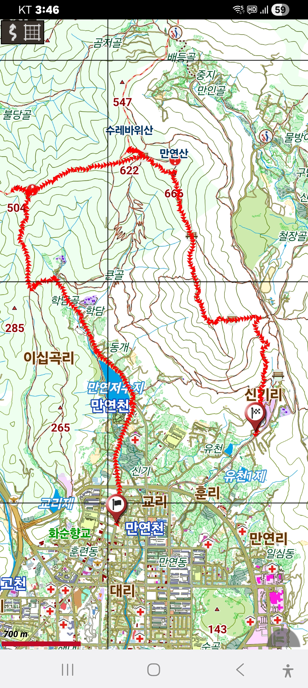 화순군청-동구리호수공원-만연지구좌측능선-수레바위(왕복)-수레바위산(왕복)-만연산-구름다리-화순만연산표석-수만리(큰재)못미쳐 오감연결길-만연폭포(10km)+ 도로이동 화순군청